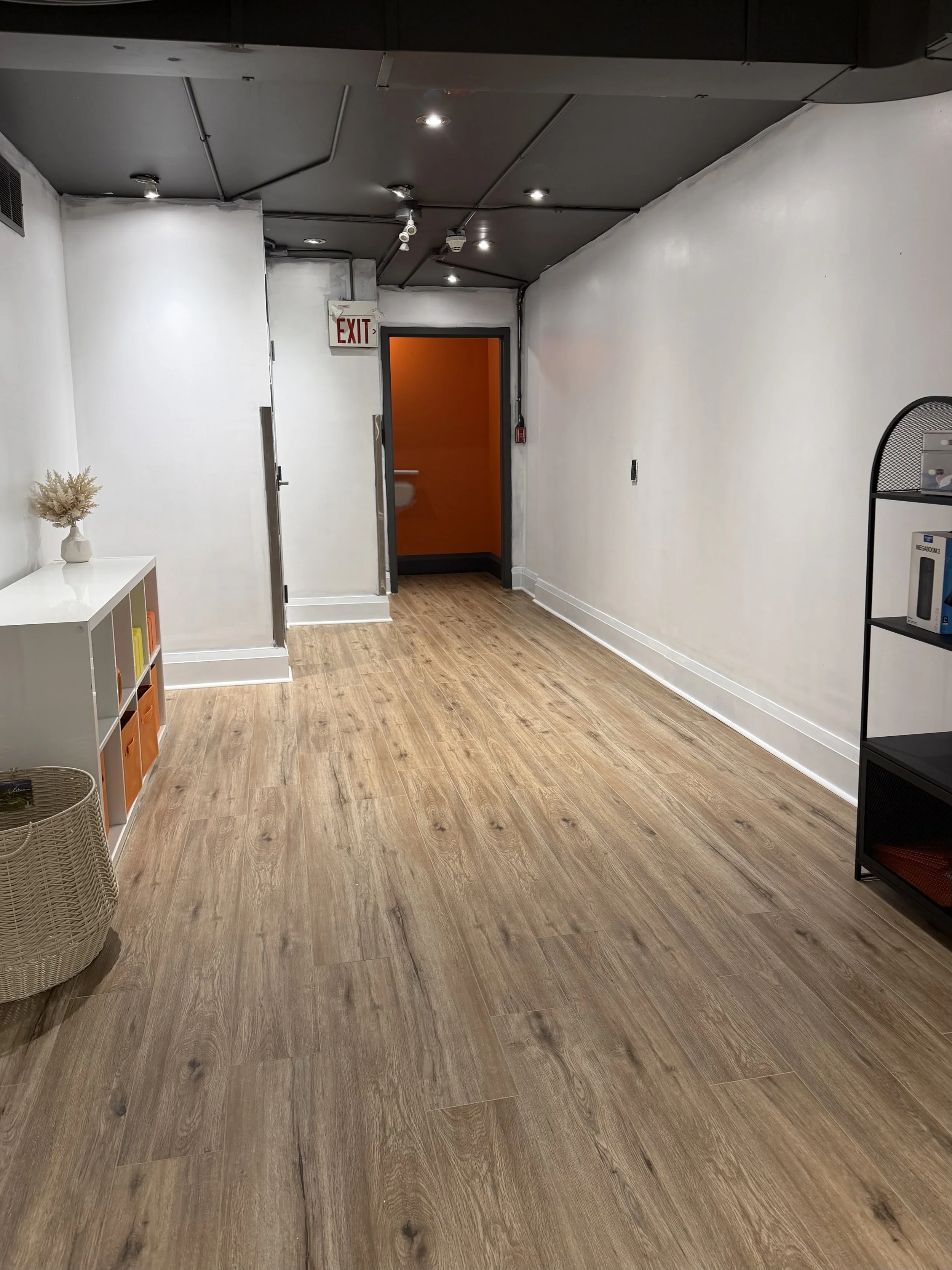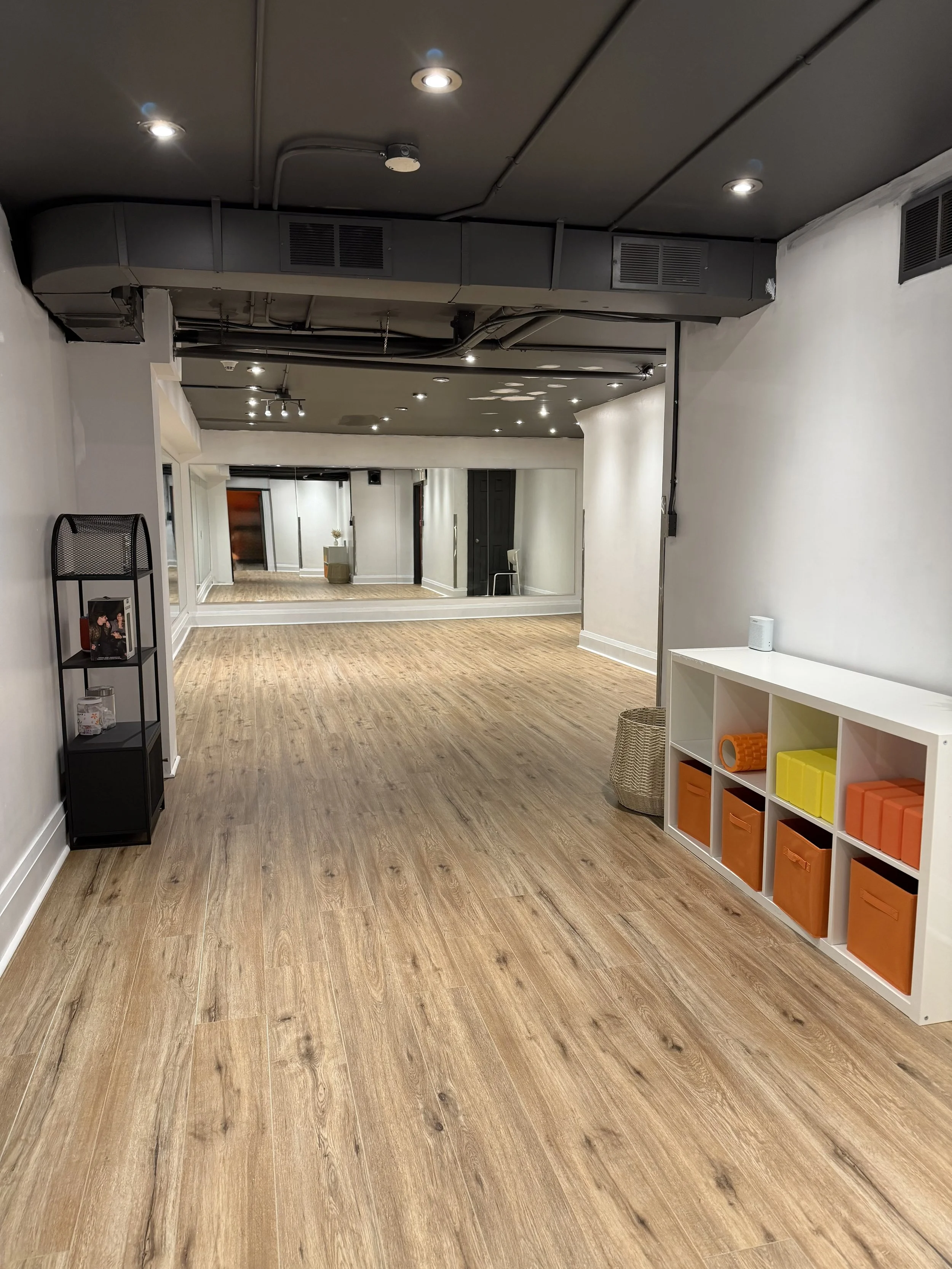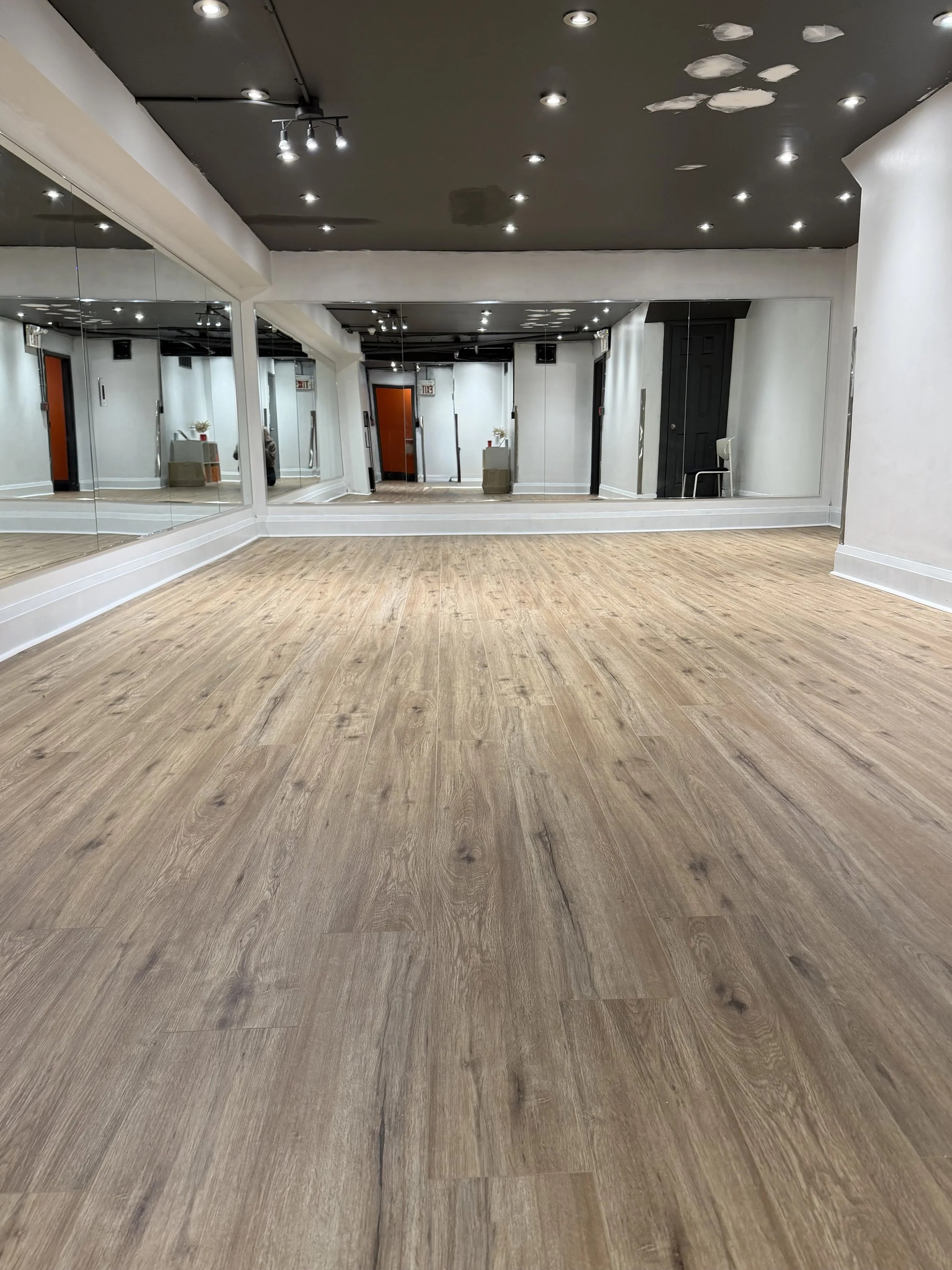 Our downstairs studio is a dedicated space designed to inspire movement, growth, and confidence. Featuring large mirrors, vinyl flooring with padding underneath to provide both comfort and support, stretching equipment and speaker, the studio creates the perfect environment for focused training, creative expression, and high-energy classes.